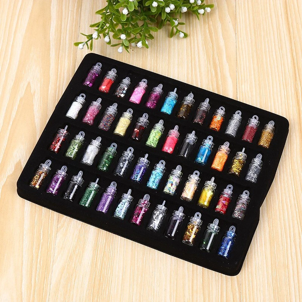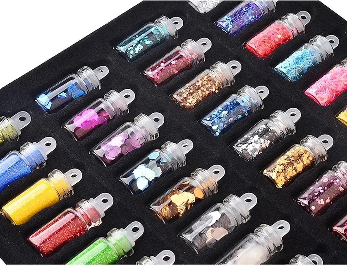 Style je nagels op alle mogelijke manieren! 48 potjes met verschillende soorten decoratieve elementen om je nagels mee te stylen, waaronder glitters.
