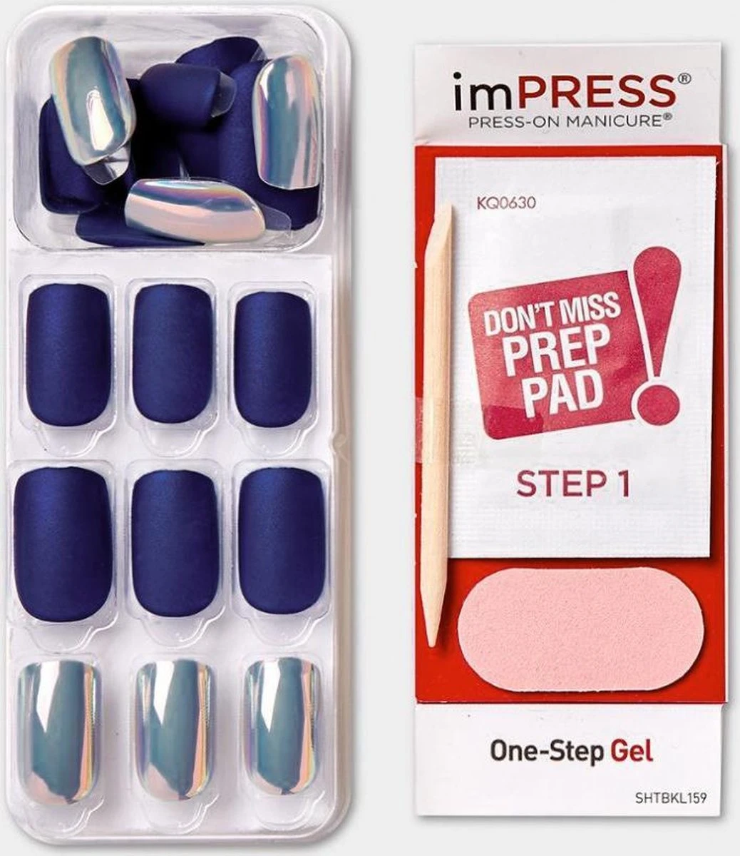 Kiss imPRESS Press-on Nails bevat 30 kunstnagels in verschillende maten, een prep pad en een manicure stick. De plaknagels zijn eenvoudig te verwijderen en beschadigen de natuurlijke nagels niet.