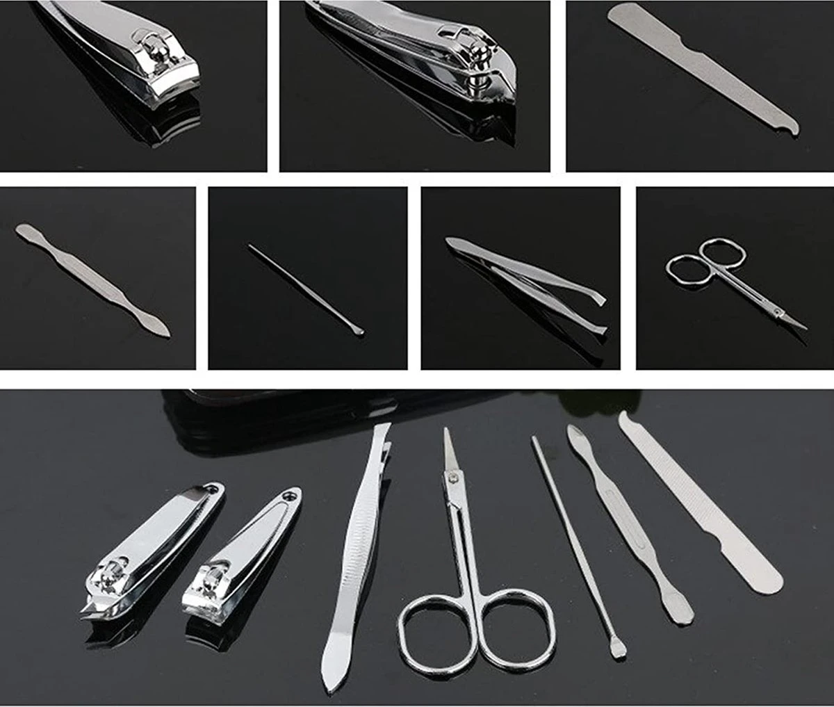 - 7 elementen in één set: de compacte manicureset bestaat uit 6 elementen, waarmee je je voet- en vingernagels kunt verzorgen. De set bevat een 8 cm lange nagelschaar en een 5 cm lange nagelknipper. De zijdelingse nagelknipper (5,5 cm) helpt ons om harde nagels te knippen of de nagelriemen in te korten, die we met de 7,5 cm lange nagelriemschuiver in de set kunnen wegschuiven.