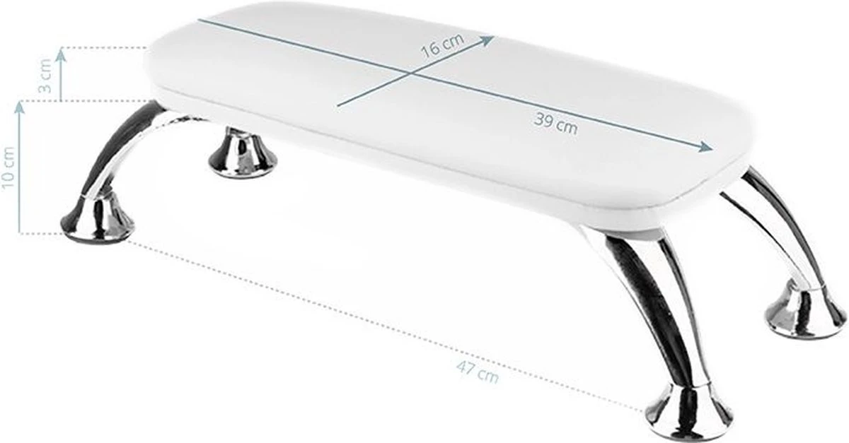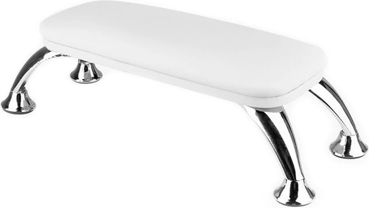 Armsteun voor nagelstyliste wit, op pootjes Afneembaar manicure-handkussen met roestvrijstalen ondersteuning, – werken in een comfortabele positie, waardoor de pijn in de wervelkolom wordt verminderd – comfortabele houding voor de cliënt, – gemakkelijk te reinigen en te desinfecteren, – de klant houdt haar hand losjes vast bij het plaatsen van haar hand op deze hogere armsteun, waardoor het verstijven van de vingers wordt vermeden – de mogelijkheid om een ​​UV/LED-lamp onder de armsteun te plaatsen, waardoor u ruimte bespaart op de nageltafel – brede afstand van de pootjes garandeert een hoge stabiliteit, – esthetische uitstraling