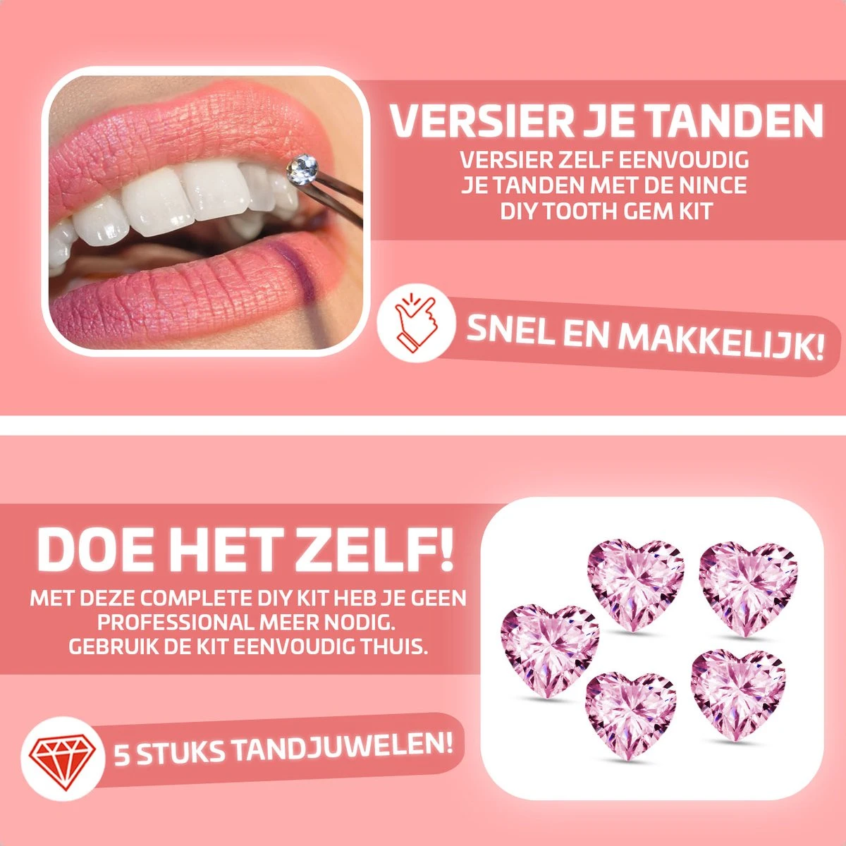 Ben jij op zoek naar een hoogwaardige (doe-het-zelf) tooth gem kit die er niet na 2 dagen al vanaf valt? De tooth gem kit van Nince is eenvoudig in gebruik, gemaakt van hoogwaardig materiaal en blijft gegarandeerd 2 tot 10 weken (of langer) zitten. Het plaatsen van de Tooth Gem is zeer eenvoudig en kan door iedereen gedaan worden.