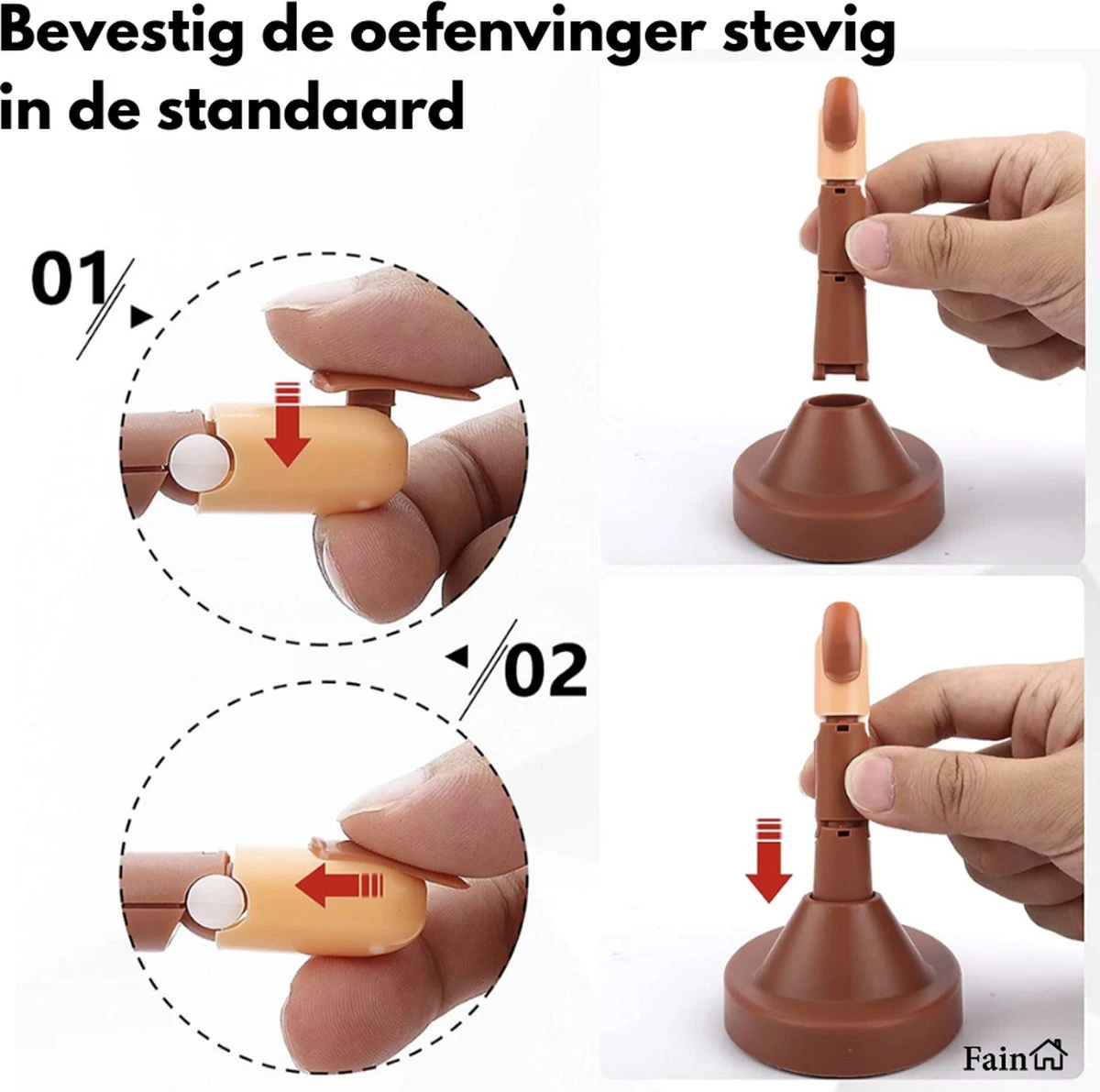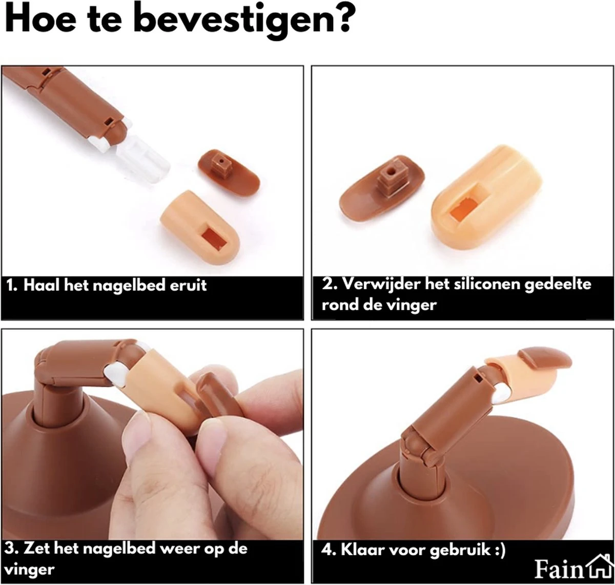 De flexibele kunstvinger is zeer gemakkelijk in gebruik. Zo is de vinger voorzien van beweegbare gewrichten en afneembare nagels. Hierdoor kan je de nailtrainer eenvoudig in de gewenste stand zetten. Daarbij wordt de nailtrainer geleverd met een losse standaard waardoor deze op elke tafel past. Dit maakt de nail trainer set dan ook direct klaar voor gebruik!