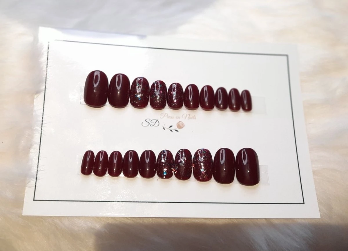 B-72 is een donkerrood setje van korte ronde nagels met multicolor glitteraccent.